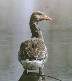 Серый гусь – это довольно крупная, плотная, красивая и сильная птица. Длина его тела может достигать 90 см, а масса равняется 3–3,54 кг. Спина и надхвостье у него пепельно-серые, живот белый, брюшко поперечно-пестрое, клюв и лапы красные или розовые.