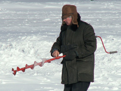 Наиболее трудоемкая операция — рубка лунок. По перволедью, когда лед еще не толст, нет надобности ни в тяжелой пешне, ни в особых усилиях: можно обойтись легким топором и легкой шабалкой. Другое дело — середина или конец зимы, когда лед достигает толщины около метра. В этом случае следует пользоваться ледобуром.