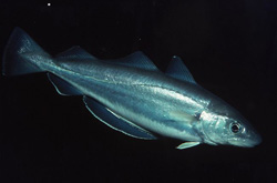 Мерланг(Merlangius merlangius). Стайная рыба. Тело прогонистое, желтовато-серое с фио-летовым оттенком на спине, серое на боках, белое в брюшной части, на подбородке усик, длинный первый анальный плавник, у основания грудного — черное пятно.