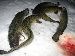 Внешность налима очень характерна: маленький усик на подбородке — отличительный признак тресковых рыб, уплощенная, сужающаяся к переду большая голова, длинное упругое тело, покрытое очень мелкой, глубоко сидящей в коже чешуей, мягкие, без колючих лучей плавники, маленькие глазки и открывающиеся на концах длинных носовых трубочек ноздри. Окраска у налима пестрая, основной цвет темно-буро-серый с желтыми и светлыми пятнами и разводами, низ белый. Яркость окраски меняется от черного до почти желтого цвета. Маленькие налимы в возрасте менее года обычно очень темные, иногда черные. А в целом скользкий и холодный — вот облик налима, и особых симпатий он не вызывает. Скользкий он действительно всегда, т. к. покрыт слоем слизи, а вот холодный — эта характеристика налима весьма субъективна. Как и все холоднокровные с изменяющейся температурой тела, зависящей от окружающей среды, летом налим нисколько не холоднее воды, в которой мы с удовольствием купаемся. Но в это время года он редко становится добычей рыболовов. Другое дело зимой: вытащенный из своей ледяной купели, да еще на студеный зимний воздух, извивающийся на льду, он поистине холоден! Но и другие рыбы в это время имеют такую же температуру тела. Рыбы могут жить и в воде с отрицательной температурой — и температура их тела в этом случае ниже нуля. Именно в таких условиях живут рыбы в водах Арктики и Антарктики, где температура морской воды достигает почти минус 2°С. Жидкости тела у этих рыб не замерзают, потому что в ходе эволюции у них выработались специальные вещества — своеобразные антифризы белковой природы — гликопептиды, понижающие точку замерзания жидкостей тела до температуры минус 2,5-3°С. А маленькая рыбка далия, или черная рыба, живущая в замерзающих водоемах Чукотки, без вреда для себя вмерзает в лед и так проводит всю зиму. После того как лед растаивает, оттаивает и рыба и сразу начинает активную жизнь. В наших водоемах температура воды зимой ниже нуля не опускается. Промышляют налима осенью, когда он выходит на мелкие места, и особенно зимой, во время нереста. Больше всего развит специальный лов налима в Сибири. В наших водах добывают налима в Псковско-Чудском, Ладожском и Онежском озерах, где налим особенно крупный (до 12 кг) и его много. Самый большой налим в водах нашего региона был пойман в 1910 г., он весил 16 кг.