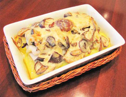 Рыбное филе надрежьте с одной стороны и раскройте как книгу. В зависимости от толщины куска сделайте 1–2 надреза. Посолите, поперчите. В надрезы вложите отложенные грибы. Как вариант, можно рыбу не надрезать, а, например, посолить-поперчить, обвалять в муке и слегка обжарить до легкой корочки. И в том и в другом случае будет вкусно, но немного по-разному. Выбирайте! Порционные керамические формы слегка смажьте сливочным маслом. Разложите проваренную картошку, сверху рыбу и залейте сметанным соусом. При желании можно еще слегка посыпать тертым сыром. Поставьте формы в разогретую до 200ºС духовку до готовности рыбы и легкого зарумянивания соуса (около 20 минут).