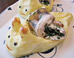 Рыбные филе положите кожей вниз и выровняйте по толщине. Для этого подрежьте мякоть более толстой хребтовой части от края к центру (но не отрезайте полностью!) и перебросьте-разложите на более тонкую часть с брюшины. Накройте филе пленкой и слегка, очень аккуратно и нежно, отбейте плоской стороной молоточка для мяса. Подготовленные филе сбрызните лимонным соком, поперчите, посолите, посыпьте зирой и оставьте на 10–15 минут мариноваться. Для начинки мелко порежьте зелень петрушки, равномерно распределите ее по рыбе и, начиная с широкого края, заверните каждое филе в рулет. При желании в начинку можно добавить тертый сыр. Чтобы рулетики не разворачивались, держали форму, скрепите их деревянными шпажками. Картофель почистите, посолите, залейте водой и сварите до готовности. Воду слейте, а картошку верните на плиту и слегка подсушите, затем добавьте сливочное масло и разомните в однородную массу. Влейте немного молока до консистенции густого пюре. Выстелите противень бумагой для выпечки. Подготовленное пюре разделите пополам и из каждой части вылепите по улитке. При этом учитывайте размер рыбной «ракушки». Из горошин черного перца и кусочка моркови сделайте глаза и рот. Перед выпечкой, чтобы улитки зарумянились, смажьте их разболтанным с небольшим количеством воды желтком.