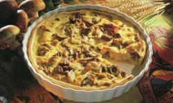 Поставить форму в духовку на среднюю планку и выпекать около 5 минут. Вынуть форму из духовки, разложить на дне ломтики шпика. Залить яичной массой с грибами, снова поставить пирог в духовку и выпекать, пока не подрумянится (около 40 минут).