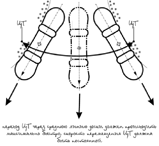 Самое сложное – почувствовать первую дугу, понять, что доска катится на канте без проскальзывания. Помочь в этом может звук: если доска сбрасывает хвост, уходит в занос, она начинает вибрировать и сильно дребезжать. На канте же доска катится почти бесшумно. А дальше все достаточно просто – подбирая ноги, разгружаете рабочий кант и одновременно переносите центр тяжести по другую сторону доски. Делать это нужно быстро и плавно, как бы, раскачиваясь над доской. Чем выше скорость, тем больше амплитуда. Если все делать правильно, переход с канта на кант будет происходить в воздухе, доска не будет даже касаться снега плоскостью.