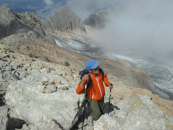 Памятуя о том, что использовать для обретения этой безупречности можно что угодно, следующим летом я решил применить то что находилось под рукой - собственно туризм как таковой. На этот раз раскладка была меньше 300 г, и с собой бралось все специальное снаряжение (килограмм 18, включая ледобуры, крючья, кошки и пр.; бралась и веревка, которая использовалась в основном на спусках). В отличие от прошлого года, задачи максимум я перед собой ставил, пожалуй, несколько выше своих возможностей - замахнулся на пару 3Б. Так что рюкзак опять получился нелегкий, по результатам похода половину спецухи можно было бы срезать.
