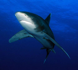 Океаническая белоплавниковая акула (Carcharhinus longimanus) это большая пелагическая акула тропических и умеренно теплых (> 18°C) морей. Обычно встречается в открытом море, редко приближается к берегу – в районах островов и рифов, поднимающихся с большой глубины. Плотное «типично акулье» тело с длинными передними плавниками (отсюда специфическое название «лонгиманус», что в переводе с латыни означает «длиннорукий». Спинной плавник закругленный. Окончания передних и спинного плавников обычно имеют белые пятна. Максимальный размер 4 м, обычно не больше 3 м, максимальный вес 170 кг. Как и все акулы, логиманус – хищник. Питается в-основном пелагическими костистыми рыбами, но не отказывается и от падали. Обычно одиночки, собираются в группы только у источников пищи. Описываются и как медлительные и ленивые, и как любопытные и настойчивые. Все сходятся на том, что они крайне непредсказуемы. Живородящи, вынашивают от 1 до 15 акулят.