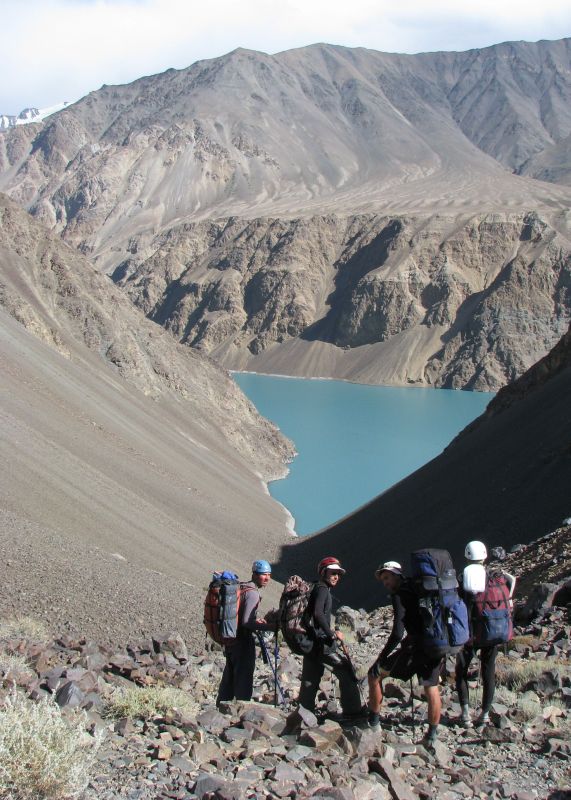 После этого был выход из района – максимально короткий и эффективный - 40 км: пер. Муркалла (2А, 5505) - р.Зорташкол - пер. Зорташ (1Б, 5100) - р. Чиксу - Памирский тракт. Погода снова установилась – стало ясно, но заметно холоднее и при броде Зорташкола для перехода его боковых рукавов приходилось вначале пробивать ледяную корку.