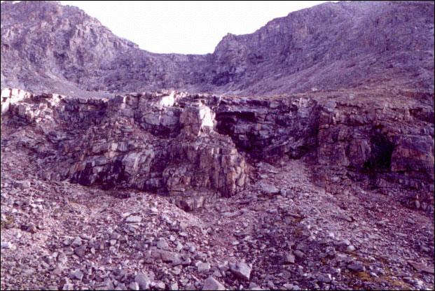 Примерно через километр река уходит в каньон. Перед каньоном появляется слабая тропа. Она хорошо просматривается на небольшом участке мелкой осыпи. Между вершиной и каньоном есть достаточно широкая полка. Тропа идёт по ней в обход каньона по увалам, местами пропадает, но потом вновь появляется. Каньон впечатляет: узкий, с отвесными стенками, высотой метров 200.