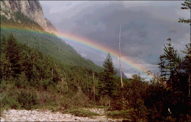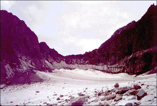 Переправа через Ледниковую возможна как против устья Изумрудной, так и несколько выше - на наш взгляд все-таки лучше переправляться не доходя до устья Изумрудной. Там же (чуть выше устья) есть и хорошие места для стоянки. Одна незадача - место совсем открытое.