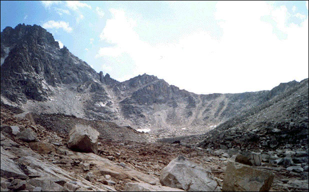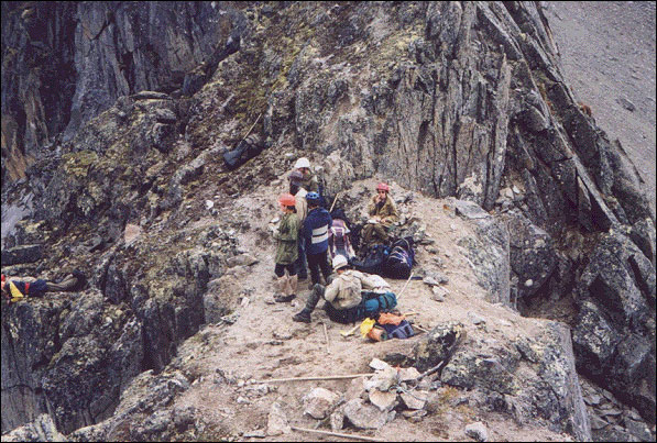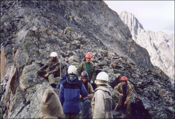 Перевал - узкий гребень и очень узкая щель. Группа из 10 человек не помещается. Собирались под скалой на границе ледника. Снята записка группы ЦДЮТЭ из Москвы под руководством Устинова от 5.08.01.