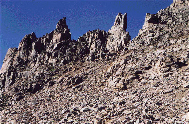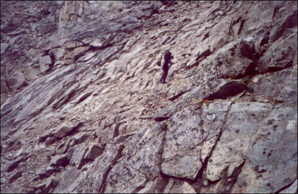 Первый участок лучше обойти слева - там есть относительно простые проходы. Спускаться лучше без рюкзаков, а рюкзаки спустить по верёвке по кратчайшему пути.