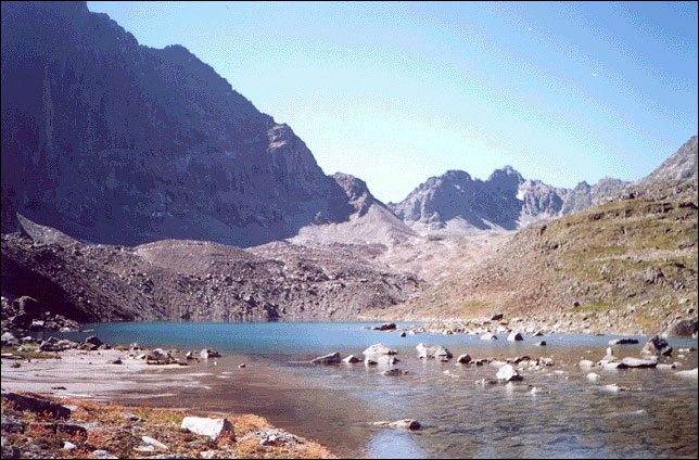 Далее по средней и мелкой осыпи до гряды. Местами даже просматривается тропа. От гряды крупная осыпь до озера. От озера ущелье выполаживается. На "зелёнке" на правом берегу появляется тропа. Здесь хорошее место для стоянки.
