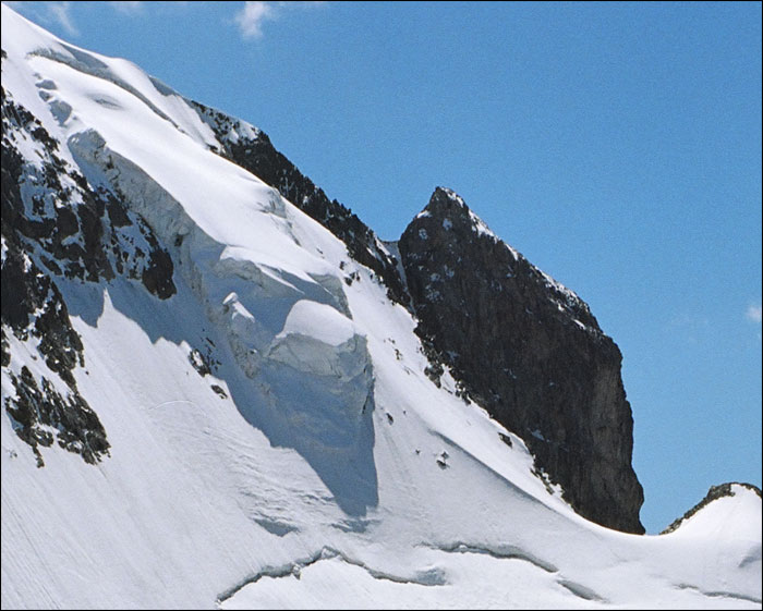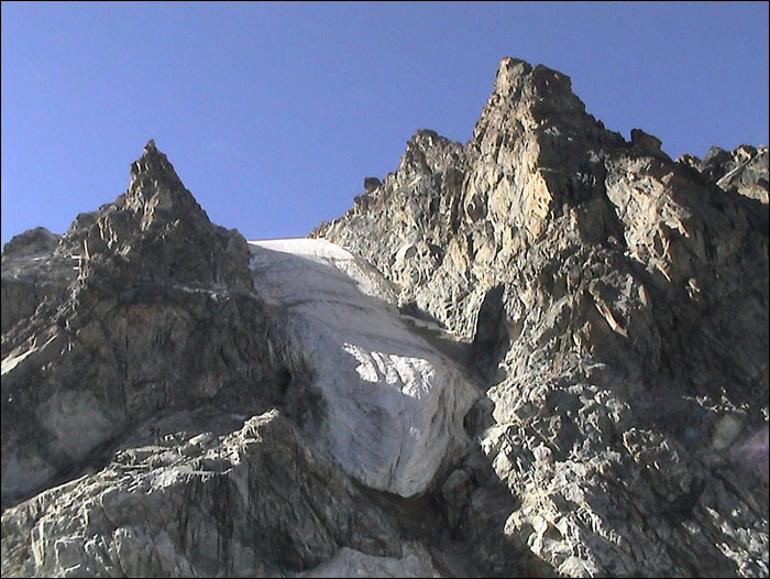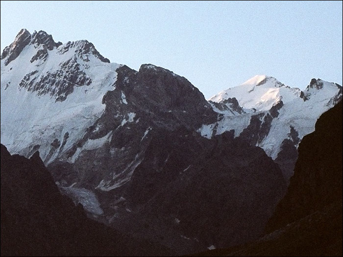 Если из альплагеря Безенги обратить свои взоры на вершину-красавицу Уллуауз (фото 1), то в ее западном гребне, перед жандармом Утюг можно увидеть характерную широкую снежную седловину над ледовыми сбросами северного склона вершины Уллуауз. Это и есть главная цель нашего путешествия - перевал Утюг.