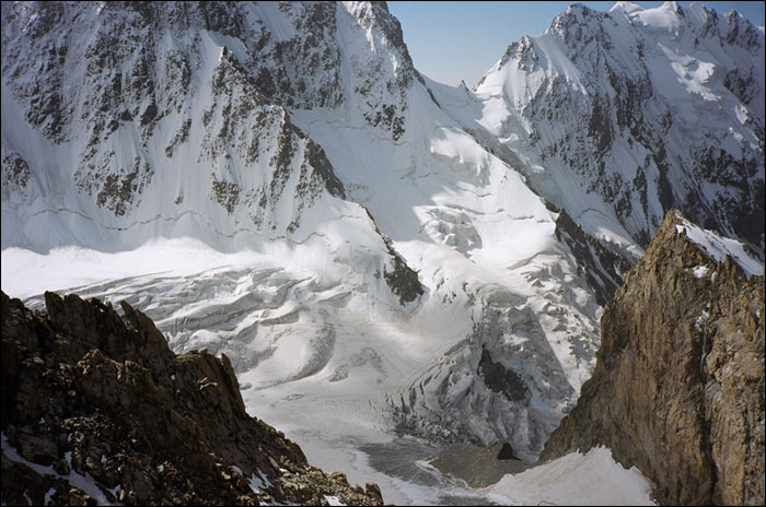Вторая ступень - наиболее сложное препятствие на пути спуска. Однозначного варианта прохождения ступени не существует - год от года, да и в рамках одного сезона, путь спуска меняется. Главный принцип прохождения этой ступени - держаться правого (орографически) борта ледника, ближе к склонам пика Панорамный.