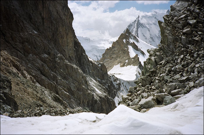 Перед самым выходом на правобережную морену ледника Кундюм-Мижирги мы прошли по узкому и тонкому снежному мосту. Вероятность его таяния в ближайшие дни была весьма высока. После того, как это случится, прохождение первой ступени в обратном направлении (на подъем) значительно затрудниться.