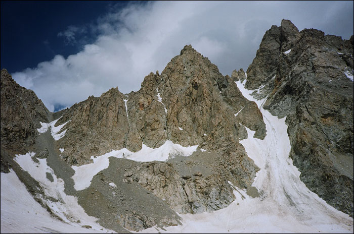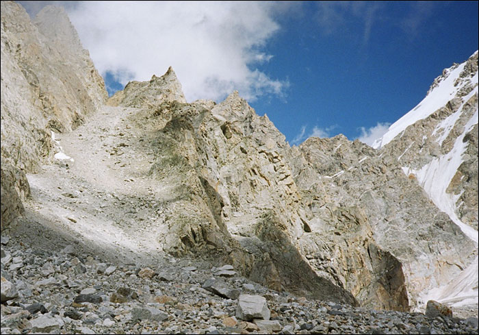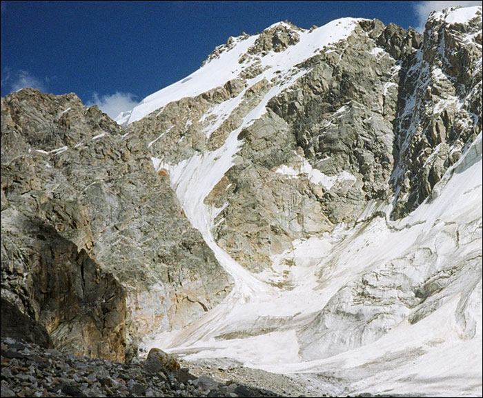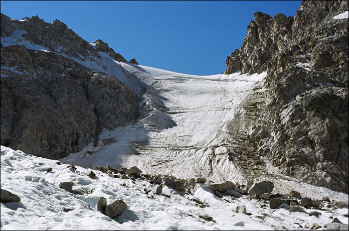 Далее вниз влево (на юг) около 300 м по кулуару до большого камня. Крутизна кулуара около 30 градусов. В начале спуск идет по сухой средней осыпи, затем по снежно-ледовому склону и вновь по скальной осыпи. Во многих местах верхний слой камней лежит на льду.
