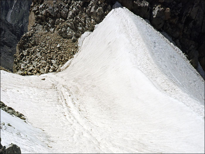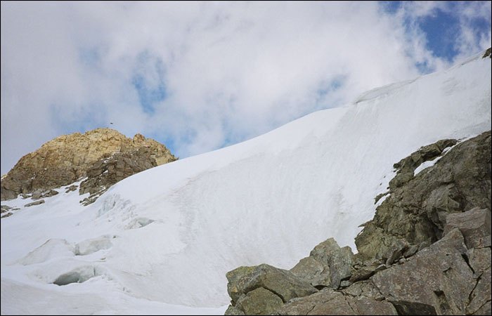 По нижнему краю бергшрунда движемся вправо до сужения и, преодолев небольшую ступеньку, движемся вверх - вправо, в направлении седловины в гребне отрога, траверсируя снежно-ледовый склон (фото 13), расположенный над нижними ледовыми сбросами. Снежно-ледовый склон представляет собой закрытый ледник крутизной около 30 - 40 градусов со множеством закрытых трещин. В верхней части он несколько положе, однако в этом месте возрастает вероятность обвалов с висячего выше ледника. Судя по лежащим растаявшим ледовым обломкам, обвалы бывают редко, со времени последнего прошло уже как минимум неделя.