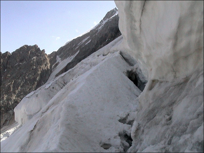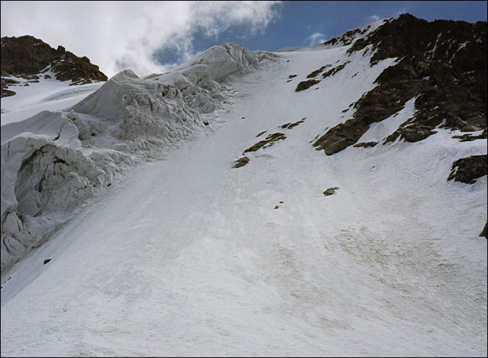 Далее вверх - вправо (по ходу) выходим на центральную ледовую часть перевального склона. Далее по открытому леднику (200 м, 40 - 45 градусов), преодолевая трещины в местах их смыкания. В верхней части ледового склона вновь приближаемся к правому берегу.