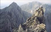 10:25 - выходим на гору. Поднимаясь к перевалу Гофмана, я наконец вижу, что левый вершинный зубец, который я принял тогда за главную вершину, не скрывается за средним, а просто снижается и превращается в жандарм, последний в гребне. По гребню идем, связавшись 8 мм веревкой, поочередно страхуя друг друга. Миновав узкий, но короткий осыпной перешеек, начинаем огибать этот жандарм. Решаем вверх пока не лезть, а осмотреться с выступающих в сторону от гребня скал. С них становится хорошо видно и основную вершину, и сам этот жандарм. На него мы и пытались залезть в прошлый раз, приняв за вершину Сабли. Разделяет их кулуар, до которого вскоре добираемся по горизонтальной полке. Отсюда без особых проблем поднимаемся на вершину.