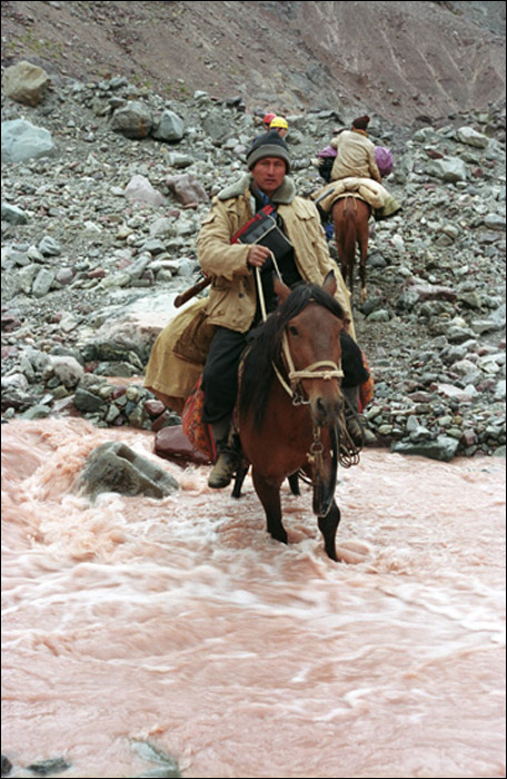 Несмотря на засушливое, по словам местных, лето и достаточно ранний час (считается, что Кызылсу можно переходить до 9 утра), обе реки были настолько полноводны, что даже переправа выше точки слияния была непростой. Чуть выше слияния нашелся камень высотой метров 5, нависающий над рекой, через который было решено пустить веревку для переправы людей. Метрах в 50 выше этого камня нашлось место, где 2 самых прыгучих участника сумели переправиться через приток Кызылсу (при этом ниже по течению стояло 2 точки страховки). Мы уже успели натянуть веревку, когда на левом берегу Кызылсу показались охотники на лошадях. После недолгих переговоров охотники согласились перевезти нас, чем сильно облегчили нашу жизнь, так как переправа через саму Кызылсу представлялась несколько сложнее, чем через приток.