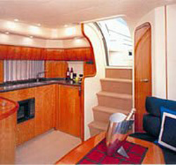 Итак, моторная яхта. Почти всегда это однокорпусное судно с развитой надстройкой и обязательным, довольно стандартным, джентльменским набором удобств: несколько просторных кают, изолированный санузел, удобный развитый камбуз, сан-дэк (для загорания), широкая кормовая площадка (для купания), холодильник, CD-аудио… Всё это есть даже на самой малой моторной яхте (кстати, практически невозможно определить чёткую границу между ней и «просто комфортабельным катером» — грубо оперируют длиной 10 метров и наличием отдельных от салона кают). С ростом длины на яхте быстро множатся элементы роскоши: VIP-каюты, отдельные душевые, гараж для гидроцикла, второй камбуз (на флайбридже), TV с матричными экранами… Системы обогрева и кондиционирования кают — само собой разумеется. Внутренняя отделка — дорогими сортами ткани и дерева, с декоративными элементами; под ногами почти всегда тиковый настил. На мегаяхтах (свыше 24 метров длиной) элементы мебели (стулья, кресла, шезлонги) зачастую даже не отличаются от домашней — на нештормовом море дискомфортных кренов и рывков просто не бывает.