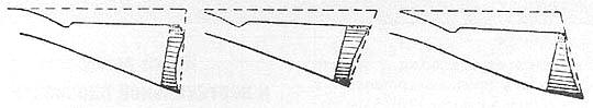 Затем в ходе выбора ружья следует медленно поднимать дульную часть ствола кверху (до встречи продолженной оси ствола с деревом рамы). На нижней стороне канала должна появиться резкая теневая фигура — отражение верхнего края окна (рис. 2). При прямом канале ствола эта тень будет иметь очертания равнобедренного треугольника с основанием у казенного среза и прямыми боковыми сторонами. При цилиндрической сверловке ствола вершина треугольника расположится у дульного среза, а в стволах с чоками — у перехода к дульному сужению, дальше будет виден второй треугольник, вершиной соприкасающийся с первым. Если в стволах есть хоть малейшая кривизна, то равнобедренные стороны треугольника в этом месте искривятся в направлении изгиба ствола, и выбор ружья на этом можно закончить, отказавшись от его приобретения. С увеличением кривизны ствола увеличивается искривление сторон теневой фигуры. При проверке каждый ствол поворачивают на 90°, затем на 180, 270 и 360°.