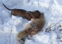 Собакам в норе приходится нелегко. Они порой вступают в бой с соперником, который превосходит их по размерам в два раза… Иногда бой в темноте может продолжаться несколько часов, порой собаки так и погибают, но не упускают зверя. Собак с длинными лапами для такой охоты лучше всего не использовать, т. к. им трудно передвигаться в узких норах. Собака также не должна быть излишне сильной – такие псы часто душат зверей, а вот вытащить лисицу на поверхность не всегда удается. Лучше всего использовать слабую, но вязкую собаку, от которой лиса спасается бегством и скорее выйдет из норы.