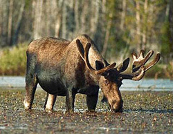Лось обычно неприхотлив к пище. Он питается побегами и листьями деревьев, с удовольствием объедает молодые ветви сосны, ест мох и лишайники, питается водорослями или грибами. Зимой его рацион состоит из коры молодых сосен, побегов, почек и коры лиственных деревьев.