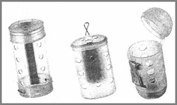Для опарыша, мотыля, червей и другой животной прикормки выпускают металлические кормушки конусной формы. Кормушку опускают на дно на тонком шнуре или леске. Донышко у нее откидное, удерживается крючком из проволоки. При встряхивании крючок выскальзывает, донышко откидывается и содержимое высыпается. То же самое происходит, когда кормушку опускают на дно и крючок выскальзывает из-за ослабления натяжения шнура. Чтобы запереть донышко, надо шнур несколько раз обернуть за основание колечка в вершине кормушки и захлестнуть за него петелькой из шнура. В этом случае донышко не откидывается — корм вымывает течение.