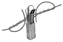 Конструкция приспособления для вязки узлов проста. Начинающий рыболов такое приспособление может сделать самостоятельно. Для этого концы трех гибких металлических пластин толщиной примерно в один сантиметр закругляют. Средняя пластина остается ровной, а концы двух боковых пластин отгибают под углом 20—30°.