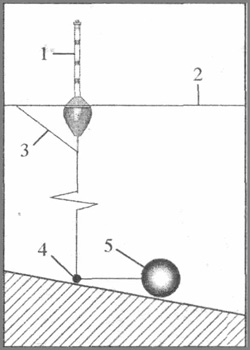 Одна дробинка крепится не далее 2,5—5 см от крючка. Вес дробинки определяют в зависимости от величины поплавка. После заброса снасти леску натягивают так, чтобы поплавок установился вертикально (на воде должен быть виден лишь кончик антеннки). Подсекать нужно даже при самом незначительном движении поплавка.