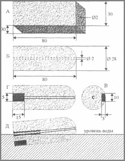 Снимают заготовку с надфиля, на боковой поверхности поплавка ножом вырезают гнездо под магнит размером 10х15 и глубиной 5 мм. Затем отверстие поплавка со стороны торца рассверливают до диаметра 5 мм на глубину 35—40 мм.