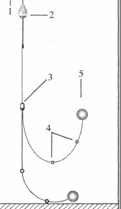 На леске прочностью 0,9—1,0 кг прикрепляют поплавок антенного типа с длинным килем. Снасть должна быть подгружена одной оливкой весом 0,1—0,3 г на расстоянии около 50 см от крючка. Для поводка между оливкой и крючком можно использовать более тонкую леску прочностью 0,2—0,5 кг. На поводке равномерно распределены две-три дробинки, что позволяет подавать наживку в свободном падении.