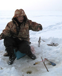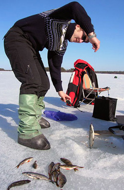 Если рыба крупная, необходимо следить за ее движением и искусно направлять в лунку. И на этой последней стадии надо, чтобы леска была натянута. Как только голова рыбы будет поднята к поверхности воды, ее хватают пальцами за голову, у затылка, надвигая руку со стороны хвоста, и выбрасывают на лед. Опытные рыболовы выбрасывают рыбу на лед багориком.