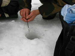 Во время вертикального перемещения мормышки надо замечать, на каком уровне чаще следуют поклевки, и затем ловить именно на установленной глубине, изменив спуск лесы или уровень положения удильника.
