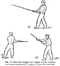 Боковой заброс двуручным удилищем справа налево с катушкой, поставленной сверху, производится так же, как и слева направо, но с изменением положения рук на удилище. При этом забросе правая рука охватывает удилище выше катушки, левая — ниже. При выполнении этого заброса, от начала его и до момента падения блесны в воду, положение рук на удилище не изменяется.