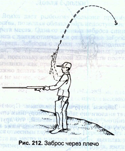 Заброс через плечо намного труднее боковых забросов. Особенно ответственный момент — освобождение барабана от тормоза. При раннем освобождении блесна высоко взлетит, вытащит много шнура, но близко упадет. При позднем же освобождении блесна резко падает чуть ли не у ног рыболова. Поэтому забросам через голову следует учиться только после полного и твердого освоения техники боковых забросов. Овладеть этими забросами необходимо, так как при ловле рыбы могут быть такие положения, при которых забросы можно сделать только через голову.