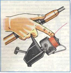 — при забросах «катушкой вверх», поставленной вверху рукоятки, — нажатие большим пальцем на наружную щечку барабана.