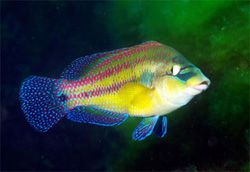 Зеленушка. Стайная рыба. Имеет пеструю яркую окраску, сотканную из зеленых, голубых, красных цветов, черное пятно на хвостовом стебле, крупные выпяченные губы.