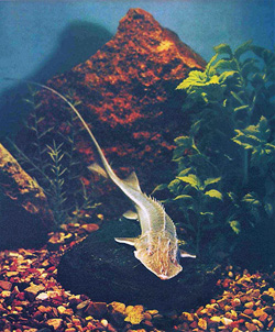 Рыло широкое, уплощенное. На конце рыла и над глазами шипики. Рот большой. Усики гладкие. Глаза маленькие. Верхняя лопасть хвоста заканчивается длинной нитью. Спинных жучек 10-14, боковых 30 — 38, брюшных 6-10. D 29-34; А 16-23.