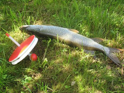 Иногда, в особенности в небольших речках, щуку успешно ловят на лягушку. Применяется тот же способ, что и при ловле на мертвую рыбку. Не допуская, чтобы лягушка погружалась, в верхнем слое воды не спеша тянут ее на себя. Зная, где обитает щука, можно ловить ее в этих местах на поплавочные удочки. Ставить их лучше на чистом месте, поблизости от осоки или камыша. Пускать живца следует в полводы. Удобно удилище, оснащенное пропускными кольцами и катушкой — это позволяет плавно забрасывать живца. Чтобы он не’закручивал лесу, следует применить оснастку. Живцами служат плотва, елец, пескарь, карась, ерш, окунь. Их лучше надевать на снасточку из двух одинарных крючков. Применение тройников нередко приводит к тому, что щука, схватив живца поперек, накалывается и отпускает его. При ловле на живца не следует спешить с подсечкой. Лучше немного подождать, не натягивая лесу, и подсекать только при движении щуки в сторону, после поклевки и остановки. Поклевка у щуки бывает различной. Обычно она решительна и резка, но при вялом клеве — осторожна и похожа на задев за мягкую траву. Сытая щука берет неохотно, но бывают случаи, когда в желудке пойманной щуки обнаруживают недавно проглоченную крупную рыбу.