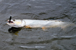 Для ловли применяют вертушки 1-3 номеров, колеблющиеся блёсны размером 7-8 сантиметров и весом 10-15 грамм, а также можно пользоваться воблерами (плавающими, с глубиной погружения не более 2 метров), используя технику сплава, джиговыми приманками
