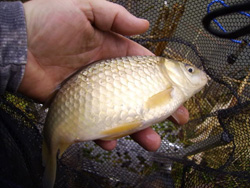 Карась, так же как и летом, сначала попытался рывком уйти в сторону от места события, потом последовала серия толчков послабее. В итоге желанный трофей оказался в руках. И хоть этот экземпляр был чуть больше ладони, главное - он был добыт зимой, а это для меня многое значило!