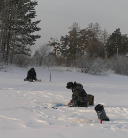 Переночевав в одном из местных домиков (база отдыха здесь имеется), снова иду на воду. В этот раз я решил попытать счастья с блесной. Забрасываю в лунку и терпеливо начинаю пробовать различные варианты игры. Авось судак клюнет. В общем, просидел я битый час, и ни судак, ни даже мелкий ершик или окунек не клюнул.