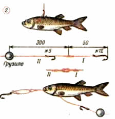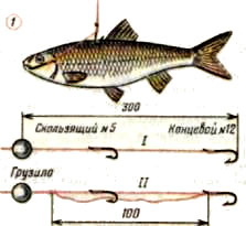 На одинарный крючок на отдельном поводке с применением скользящего крючка. Концевой одинарный крючок № 12, прикрепленный к поводку, пропускается через рот под жаберную крышку до прокола ноздри, а скользящий крючок крепится под хребет или спинной плавник (рис. 2).