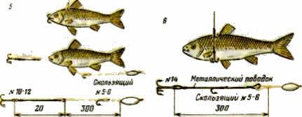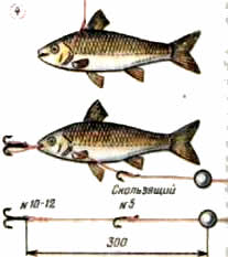 На поводке с одинарным крючком делается незатягиваюшаяся петля. К леске приматывают скользящий крючок и на ней вяжут такую же незатягивающуюся петлю, которую пропускают под жаберную крышку в рот, соединяют с петлей поводка и продергивают до прокола концевым крючком ноздри, а скользящий крючок сдвигают к живцу и цепляют под хребет.