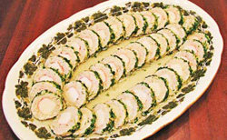 После варки дайте рулетам полностью остыть, а затем уберите в холодильник на 5–6 часов, а лучше на ночь, чтобы рулеты застыли – уплотнились и не крошились при нарезании (пленку пока не снимайте). После холодильника рулеты аккуратно разверните. На основе рыбного бульона приготовьте желатиновый раствор (в соответствии с инструкцией на упаковке желатина). Смажьте рулеты желатиновым раствором и обваляйте в мелко нарезанной зелени укропа. Рулеты поставьте в холодильник, чтобы застыло желе и укроп плотно держался на поверхности, а далее нарежьте на ломтики желаемой толщины. На дно сервировочного блюда налейте немного бульона с желатином и дайте застыть. На застывшем желе разложите нарезанные рыбные рулеты, слегка полейте бульоном и уберите в холодильник до застывания, чтобы рулеты зафиксировались. Далее в несколько приемов залейте рулеты желатиновым раствором, чтобы они покрылись слоем желе. Между заливками ставьте блюдо в холодильник, чтобы очередной желатиновый слой схватился, а после окончательной заливки уберите в холодильник как минимум на два часа до полного застывания.