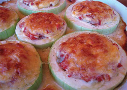 Для рецепта понадобится: 300 г рыбного филе (у меня треска, но можно взять практически любую), 30 г свиного сала (можно готовить и без него или заменить сливочным маслом), 100 г риса, луковица, по пучку укропа и петрушки, соль, перец, примерно 800 г кабачков, 3–4 помидора, 1–2 дольки чеснока, 3–4 столовые ложки майонеза, 50 г сыра. Рис промойте и отварите до полуготовности. Как вариант, можно просто залить кипятком и дать полностью остыть. Перед добавлением в фарш воду, конечно же, нужно слить. Рыбное филе, сало и лук прокрутите через мясорубку. Зелень мелко порубите. Смешайте рыбный фарш, рис и нарезанную зелень. Посолите-поперчите. Если будете готовить со сливочным маслом, вмешайте в фарш кусочки масла. При желании можно вбить куриное яйцо. Все хорошо вымешайте в однородную массу. Кабачки очистите от кожуры и нарежьте на кружки толщиной примерно 1,5 сантиметра. В каждом кружке вырежьте и удалите серединку с семенами. Из помидоров удалите семена, а стеночки мелко нарежьте. При желании добавьте мелко порубленный чеснок. Противень или керамическую форму для запекания смажьте сливочным маслом и про- сыпьте панировочными сухарями. Разложите кружки кабачков, посолите. Вырезанную се- редину каждого кабачка заполните рыбной начинкой. Сверху разложите нарезанные помидоры, посолите, поперчите. Смажьте тонким слоем майонеза, посыпьте тертым сыром. Поставьте противень с кабачками в нижнюю треть разогретой до 180 градусов духовки и запекайте в течение 30–40 минут до зарумянивания сырной шапочки и мягкости кабачка (готовый кабачок должен легко протыкаться кончиком ножа). Приятного аппетита!