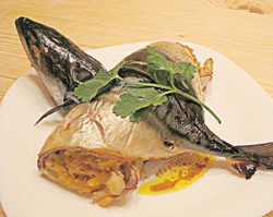 Для рецепта вам понадобится: 1 скумбрия, 1 средняя морковь, половина луковицы, зубчик чеснока, 0,5 чайной ложки (или по вкусу) мелко натертого свежего имбиря, 1–2 чайные ложки соевого соуса, растительное масло для обжаривания овощей, соль, перец. Скумбрию выпотрошите, удалив внутренности и в обязательном порядке черную пленочку, выстилающую брюшную полость. Удалите жабры, плавники, оставив только хвостовой. Отрежьте и отложите голову – она понадобится для украшения блюда. Продлите надрез, сделанный для потрошения рыбы, вплоть до хвостового плавника. Аккуратно, двигаясь все время вдоль костей, отделите хребет от мякоти и удалите. Выберите и удалите кости. Подготовленное рыбное филе выровняйте по толщине. Для этого подрежьте часть мякоти спинки (но не отрезайте полностью) и перебросьте на область брюшины. Рыбу посолите, поперчите, при желании сбрызните лимонным соком и пока отложите.