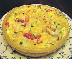 Рыба, запеченная в омлете, это очень традиционно, бесспорно вкусно, но – скучно. Для семейного ужина вполне, но, к сожалению, не более. Предлагаю приготовить знакомый рецепт на новый лад: сделать из макарон корзиночку, заполнить ее кусочками обжаренной рыбы, дольками сладкого перца, луком, все залить омлетом, посыпать сыром, а затем запечь. Быстро, вкусно и празднично-красиво. Попробуйте!